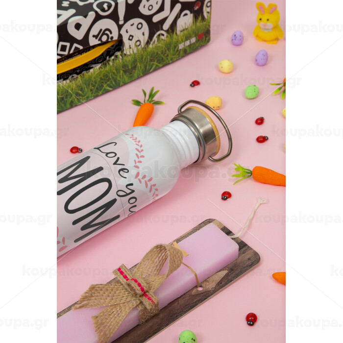Mother's day I Love you Mom heart, Πασχαλινή Λαμπάδα με παγούρι μεταλλικό (620ml, stainless steel) & κερί αρωματικό πλακέ (30cm) (ΡΟΖ)