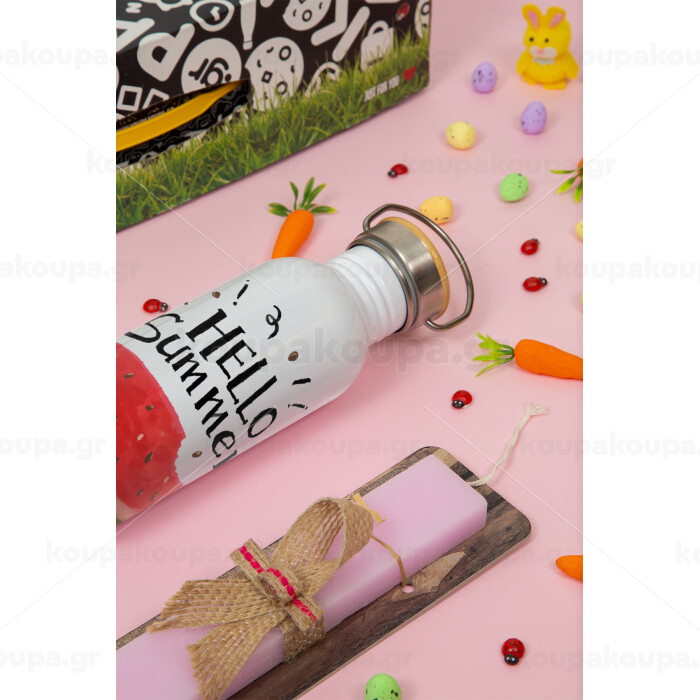 Summer Watermelon, Πασχαλινή Λαμπάδα με παγούρι μεταλλικό (620ml, stainless steel) & κερί αρωματικό πλακέ (30cm) (ΡΟΖ)