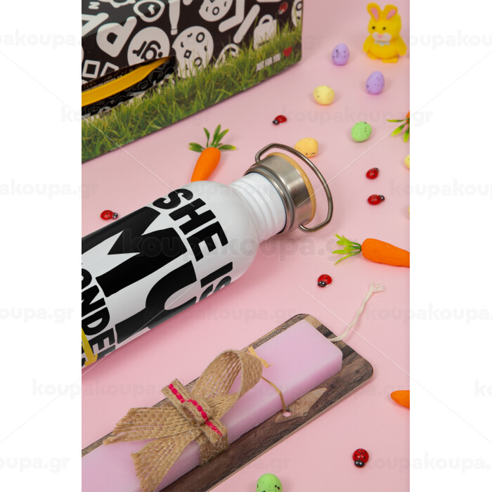 She is my wonder woman, Πασχαλινή Λαμπάδα με παγούρι μεταλλικό (620ml, stainless steel) & κερί αρωματικό πλακέ (30cm) (ΡΟΖ)