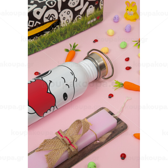 Snoopy takemy heart, Πασχαλινή Λαμπάδα με παγούρι μεταλλικό (620ml, stainless steel) & κερί αρωματικό πλακέ (30cm) (ΡΟΖ)