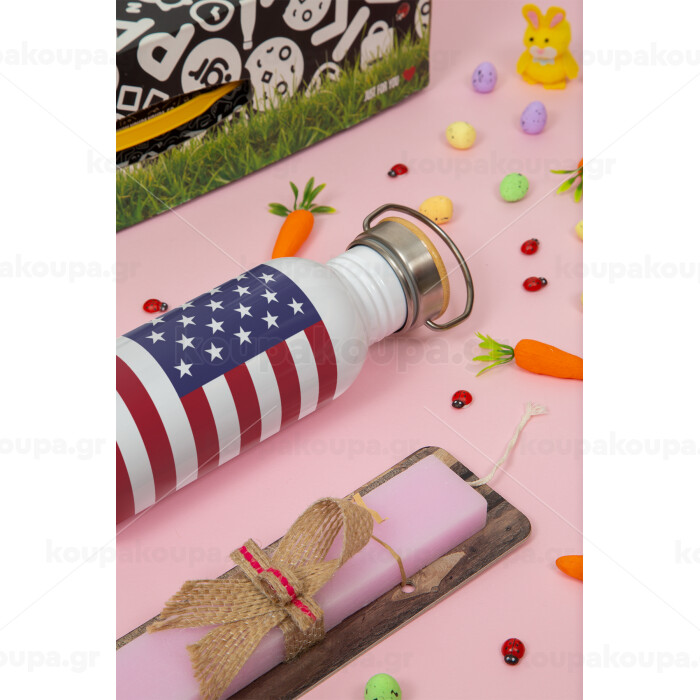 Σημαία Αμερικής, Πασχαλινή Λαμπάδα με παγούρι μεταλλικό (620ml, stainless steel) & κερί αρωματικό πλακέ (30cm) (ΡΟΖ)
