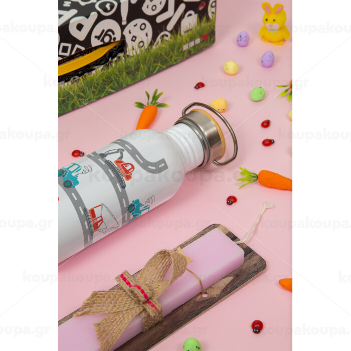 Αμαξάκια στον δρόμο, Πασχαλινή Λαμπάδα με παγούρι μεταλλικό (620ml, stainless steel) & κερί αρωματικό πλακέ (30cm) (ΡΟΖ)