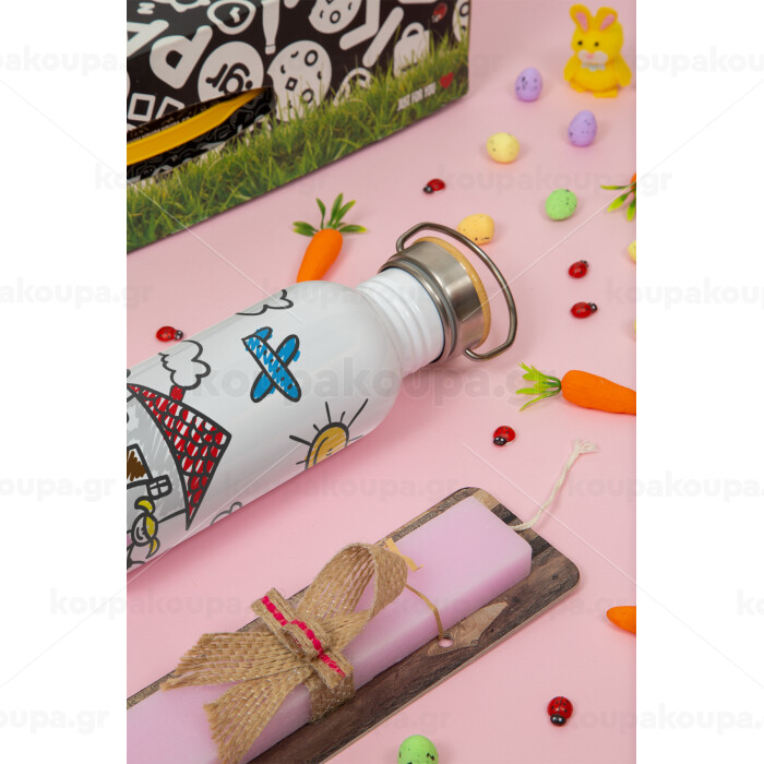 Παιδική ζωγραφιά, Πασχαλινή Λαμπάδα με παγούρι μεταλλικό (620ml, stainless steel) & κερί αρωματικό πλακέ (30cm) (ΡΟΖ)