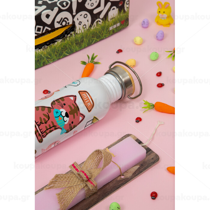 Cats and Fishes, Πασχαλινή Λαμπάδα με παγούρι μεταλλικό (620ml, stainless steel) & κερί αρωματικό πλακέ (30cm) (ΡΟΖ)