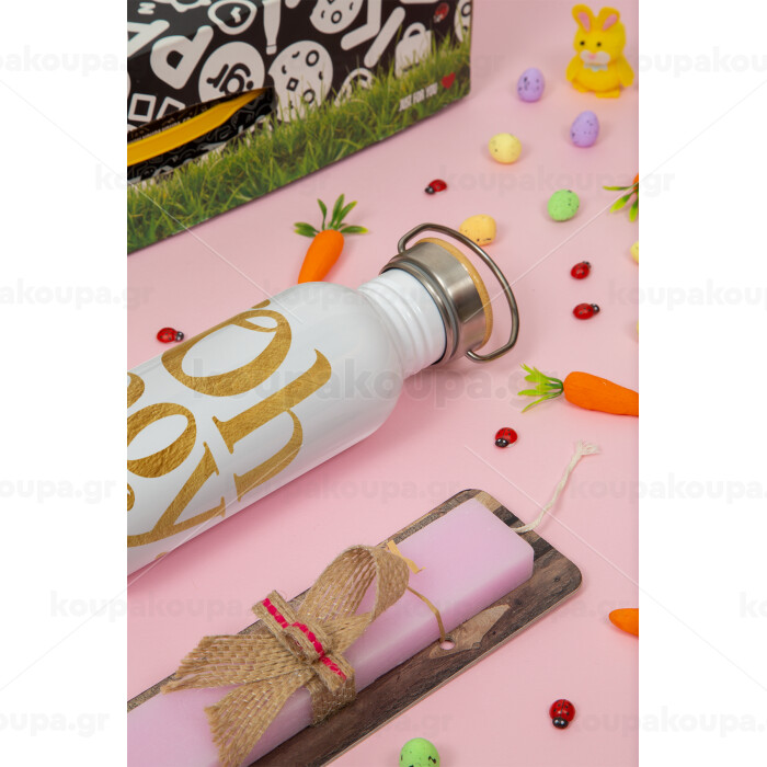 Oh baby gold, Πασχαλινή Λαμπάδα με παγούρι μεταλλικό (620ml, stainless steel) & κερί αρωματικό πλακέ (30cm) (ΡΟΖ)