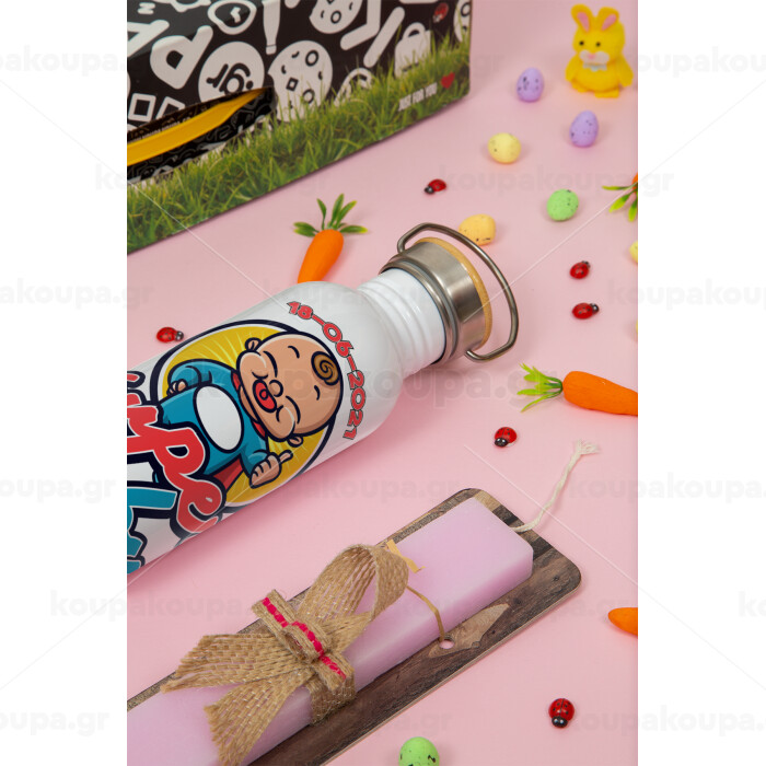 Super baby., Πασχαλινή Λαμπάδα με παγούρι μεταλλικό (620ml, stainless steel) & κερί αρωματικό πλακέ (30cm) (ΡΟΖ)