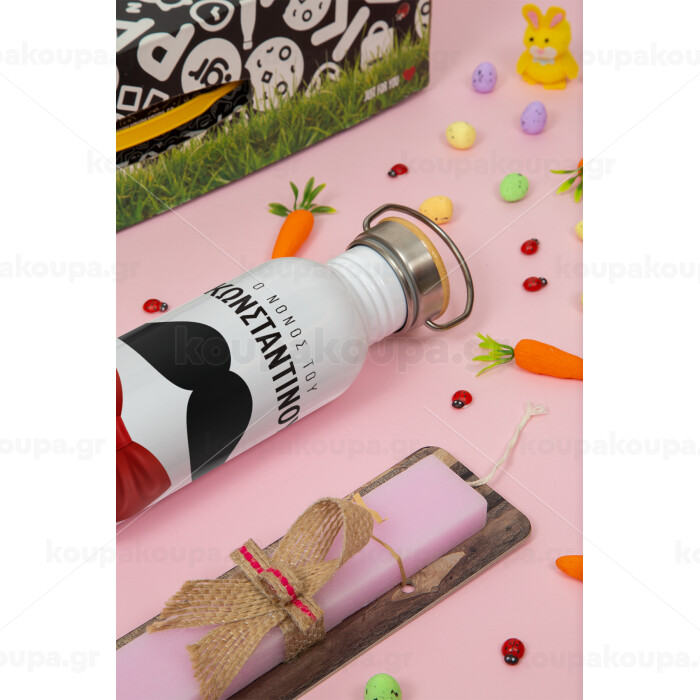 Ο νονός μου, μουστάκι με παπιγιόν, Πασχαλινή Λαμπάδα με παγούρι μεταλλικό (620ml, stainless steel) & κερί αρωματικό πλακέ (30cm) (ΡΟΖ)