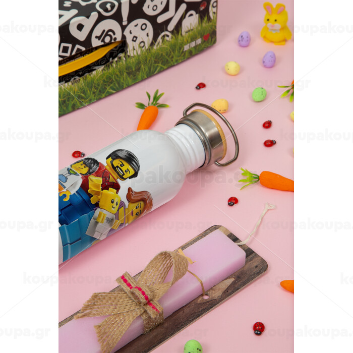 Τύπου Lego family, Πασχαλινή Λαμπάδα με παγούρι μεταλλικό (620ml, stainless steel) & κερί αρωματικό πλακέ (30cm) (ΡΟΖ)