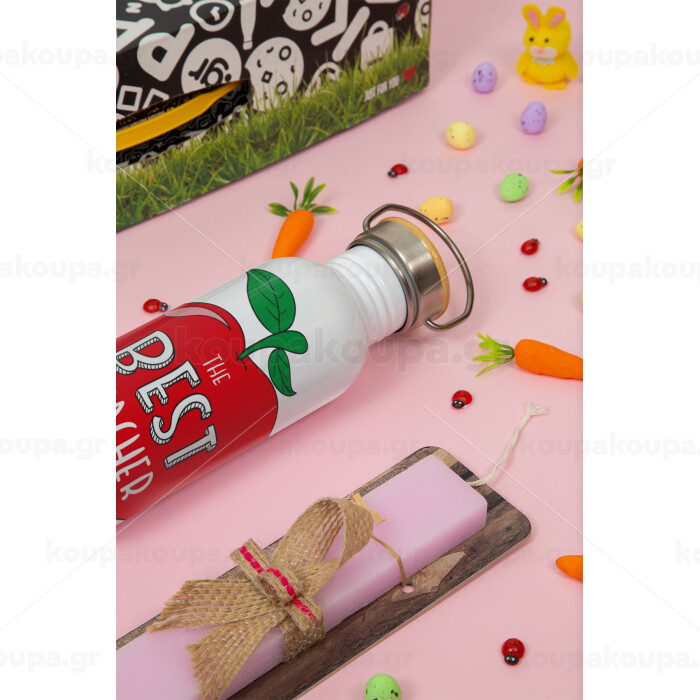 Best teacher, Πασχαλινή Λαμπάδα με παγούρι μεταλλικό (620ml, stainless steel) & κερί αρωματικό πλακέ (30cm) (ΡΟΖ)
