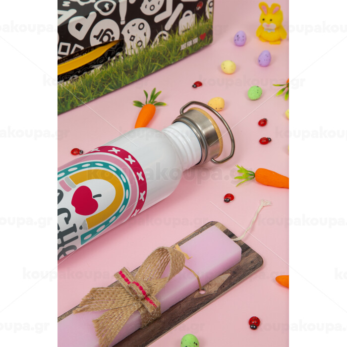 Rainbow teacher, Πασχαλινή Λαμπάδα με παγούρι μεταλλικό (620ml, stainless steel) & κερί αρωματικό πλακέ (30cm) (ΡΟΖ)