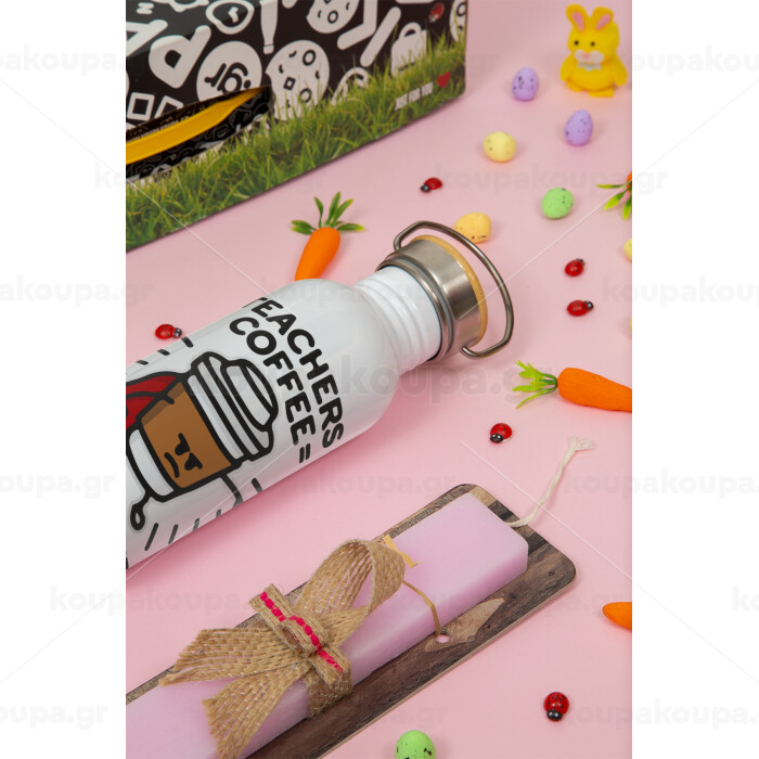Teacher Coffee Super Power, Πασχαλινή Λαμπάδα με παγούρι μεταλλικό (620ml, stainless steel) & κερί αρωματικό πλακέ (30cm) (ΡΟΖ)