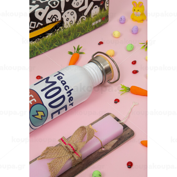 Teacher mode, Πασχαλινή Λαμπάδα με παγούρι μεταλλικό (620ml, stainless steel) & κερί αρωματικό πλακέ (30cm) (ΡΟΖ)
