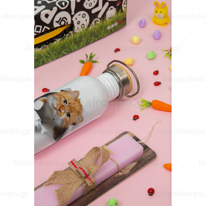 Cat cracked, Πασχαλινή Λαμπάδα με παγούρι μεταλλικό (620ml, stainless steel) & κερί αρωματικό πλακέ (30cm) (ΡΟΖ)