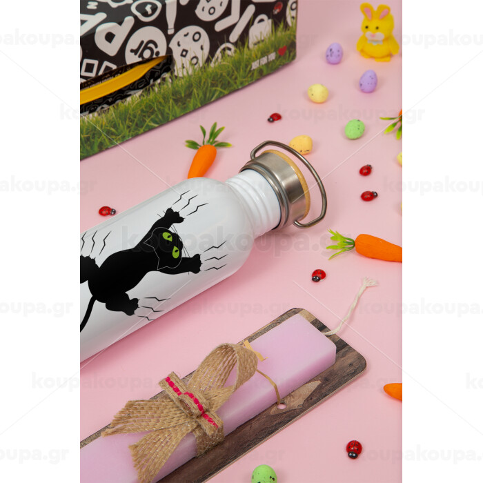 Γατούλα γρατζουνιά, Πασχαλινή Λαμπάδα με παγούρι μεταλλικό (620ml, stainless steel) & κερί αρωματικό πλακέ (30cm) (ΡΟΖ)