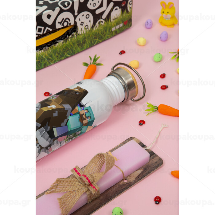 Minecraft brick, Πασχαλινή Λαμπάδα με παγούρι μεταλλικό (620ml, stainless steel) & κερί αρωματικό πλακέ (30cm) (ΡΟΖ)