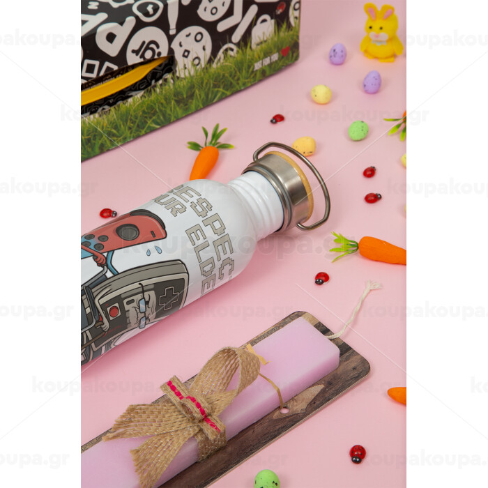 Respect your Elders, Πασχαλινή Λαμπάδα με παγούρι μεταλλικό (620ml, stainless steel) & κερί αρωματικό πλακέ (30cm) (ΡΟΖ)