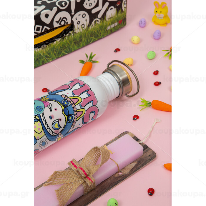 Labubu Stitch, Πασχαλινή Λαμπάδα με παγούρι μεταλλικό (620ml, stainless steel) & κερί αρωματικό πλακέ (30cm) (ΡΟΖ)