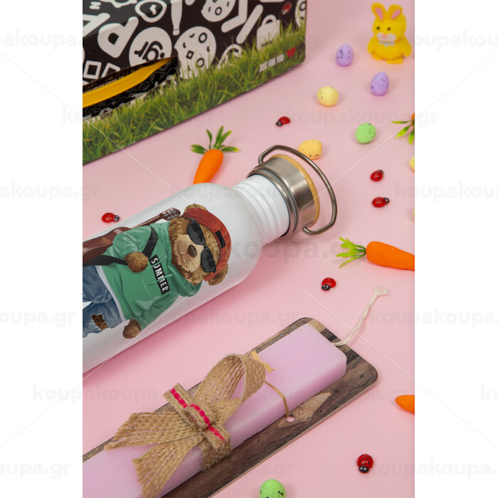 Let's Party Bear, Πασχαλινή Λαμπάδα με παγούρι μεταλλικό (620ml, stainless steel) & κερί αρωματικό πλακέ (30cm) (ΡΟΖ)