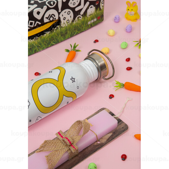 Ζώδια Ταύρος, Πασχαλινή Λαμπάδα με παγούρι μεταλλικό (620ml, stainless steel) & κερί αρωματικό πλακέ (30cm) (ΡΟΖ)