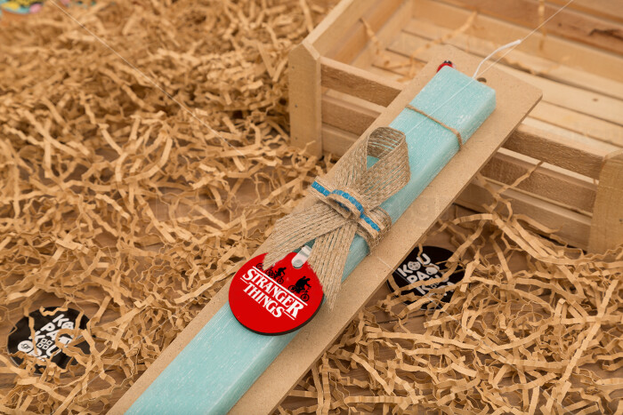 Stranger Things red, Πασχαλινή Λαμπάδα με ξύλινο μπρελόκ & κερί αρωματικό πλακέ (30cm) (ΤΙΡΚΟΥΑΖ)