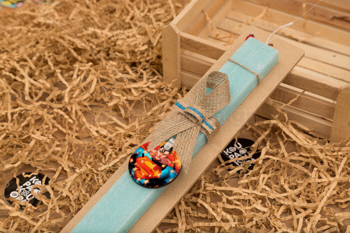 Superman angry, Πασχαλινή Λαμπάδα με ξύλινο μπρελόκ & κερί αρωματικό πλακέ (30cm) (ΤΙΡΚΟΥΑΖ)