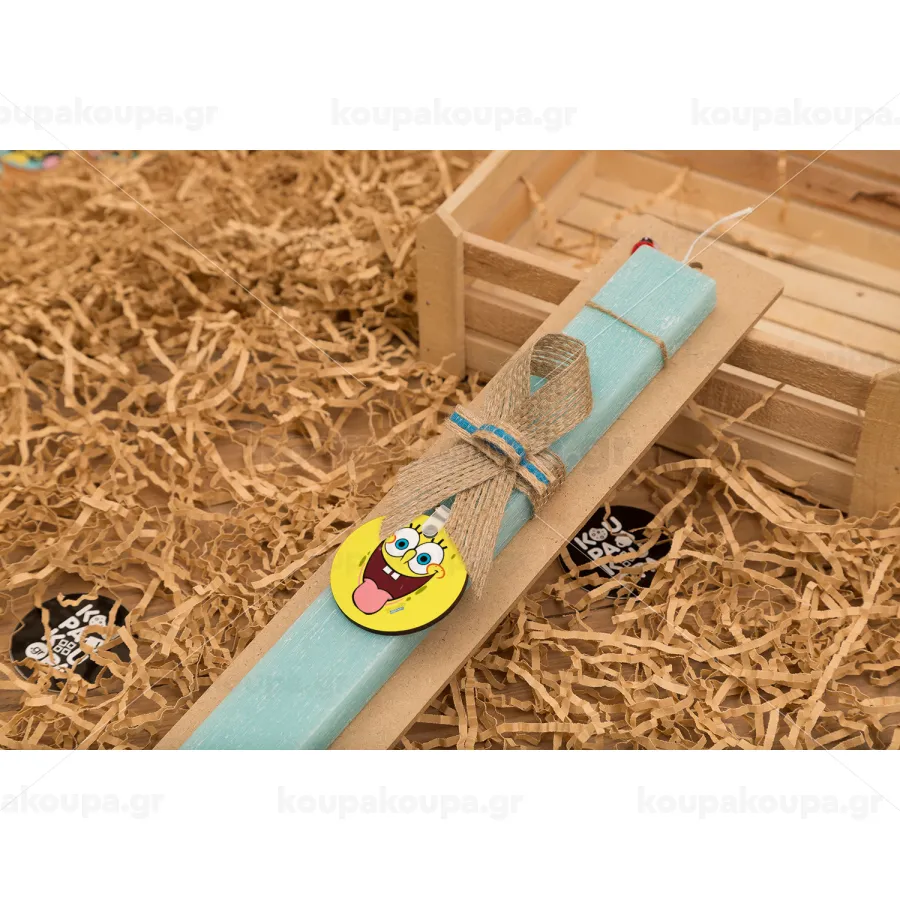 Μπομπ Σφουγγαράκης χαμόγελο, Πασχαλινή Λαμπάδα με ξύλινο μπρελόκ & κερί αρωματικό πλακέ (30cm) (ΤΙΡΚΟΥΑΖ)
