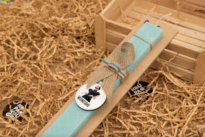 Wednesday Adams, dance with hands, Πασχαλινή Λαμπάδα με ξύλινο μπρελόκ & κερί αρωματικό πλακέ (30cm) (ΤΙΡΚΟΥΑΖ)