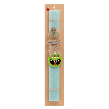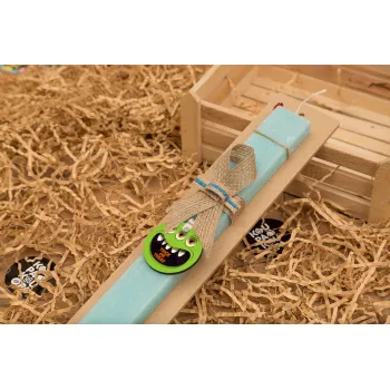 Halloween trick or treat 3 eyes monster, Πασχαλινή Λαμπάδα με ξύλινο μπρελόκ & κερί αρωματικό πλακέ (30cm) (ΤΙΡΚΟΥΑΖ)