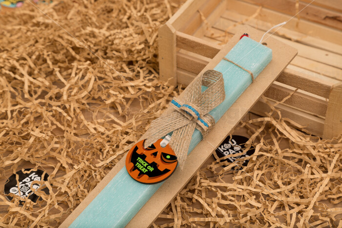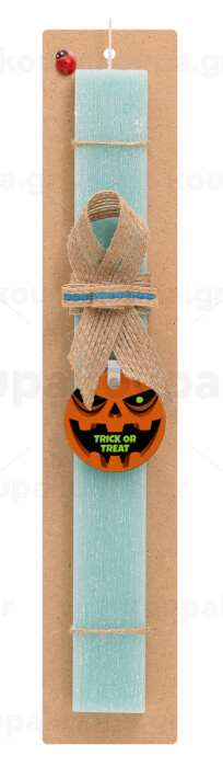 Halloween trick or treat Pumpkins, Πασχαλινή Λαμπάδα με ξύλινο μπρελόκ & κερί αρωματικό πλακέ (30cm) (ΤΙΡΚΟΥΑΖ)