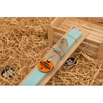 Happy Halloween pumpkin, Πασχαλινή Λαμπάδα με ξύλινο μπρελόκ & κερί αρωματικό πλακέ (30cm) (ΤΙΡΚΟΥΑΖ)