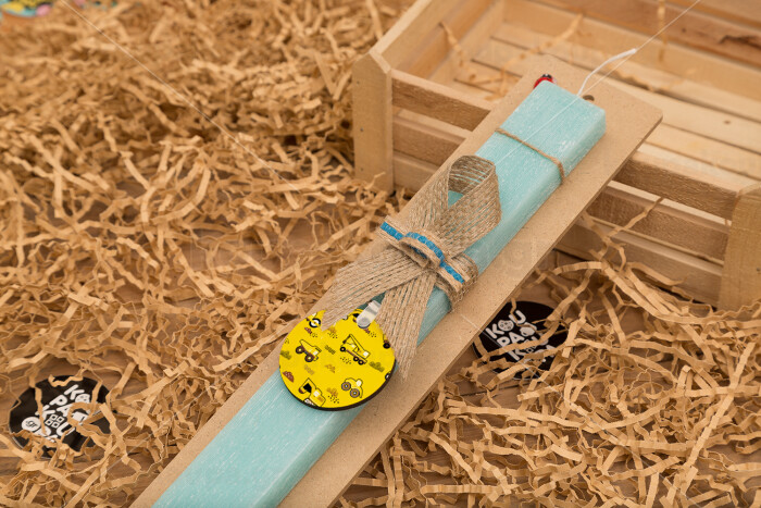 Αμαξάκια φορτωτές και μπουλντόζες, Πασχαλινή Λαμπάδα με ξύλινο μπρελόκ & κερί αρωματικό πλακέ (30cm) (ΤΙΡΚΟΥΑΖ)