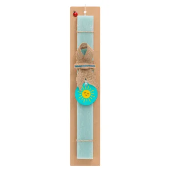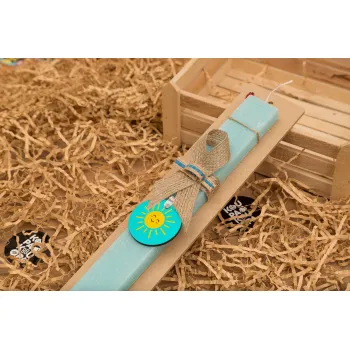 Happy sun, Πασχαλινή Λαμπάδα με ξύλινο μπρελόκ & κερί αρωματικό πλακέ (30cm) (ΤΙΡΚΟΥΑΖ)