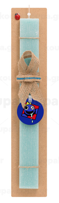 Blue, Rainbow friends, Πασχαλινή Λαμπάδα με ξύλινο μπρελόκ & κερί αρωματικό πλακέ (30cm) (ΤΙΡΚΟΥΑΖ)