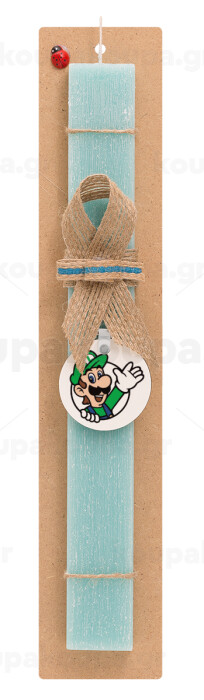 Super mario Luigi win, Πασχαλινή Λαμπάδα με ξύλινο μπρελόκ & κερί αρωματικό πλακέ (30cm) (ΤΙΡΚΟΥΑΖ)