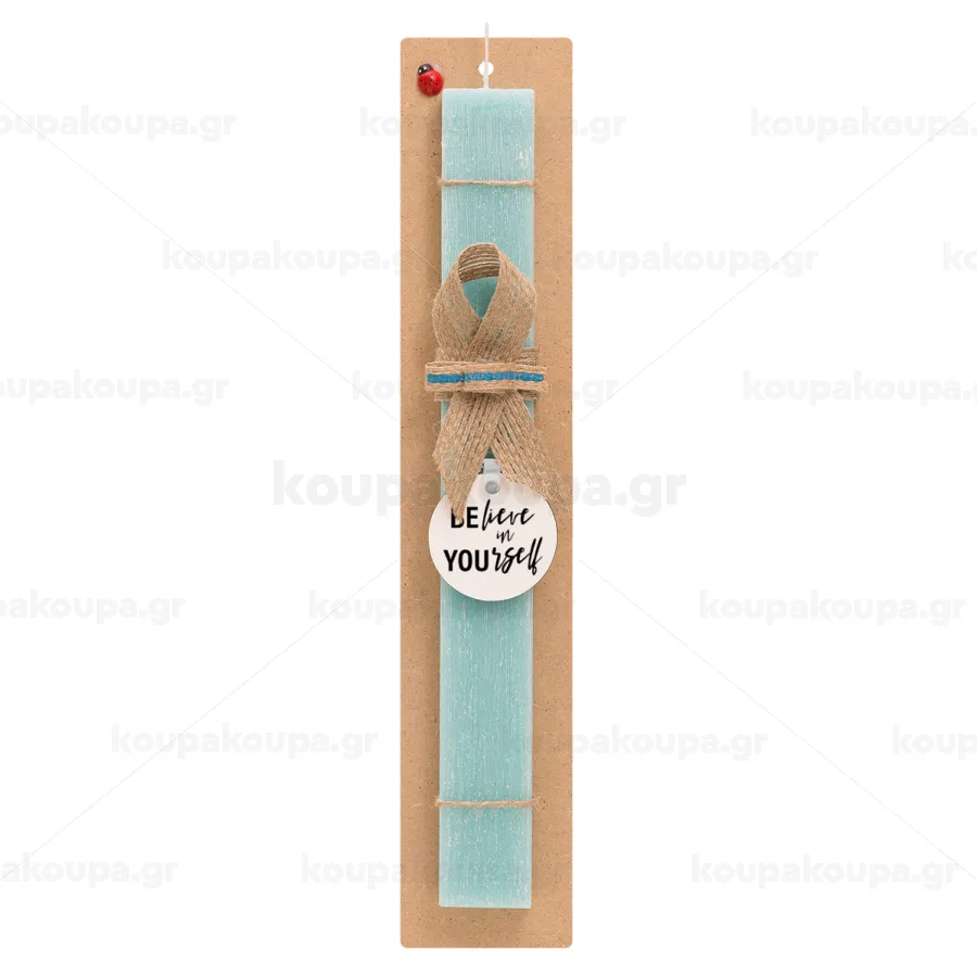 Believe in your self, Πασχαλινή Λαμπάδα με ξύλινο μπρελόκ & κερί αρωματικό πλακέ (30cm) (ΤΙΡΚΟΥΑΖ)
