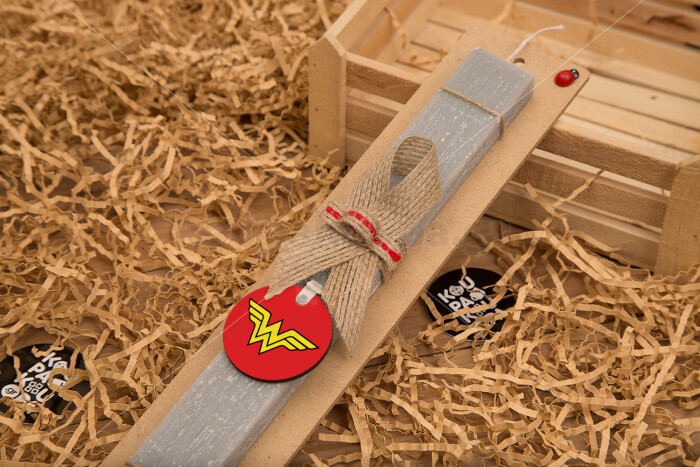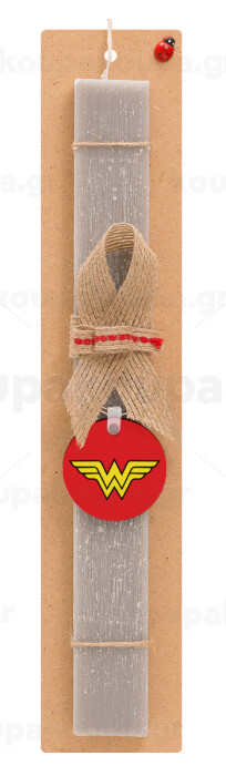 Wonder woman, Πασχαλινή Λαμπάδα με ξύλινο μπρελόκ & κερί αρωματικό πλακέ (30cm) (ΓΚΡΙ)