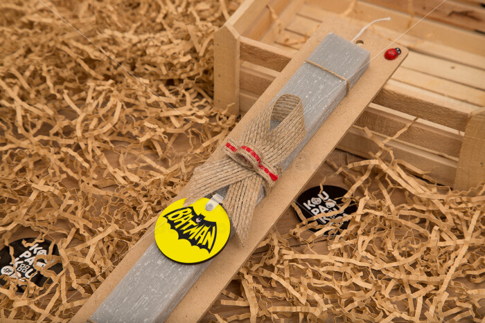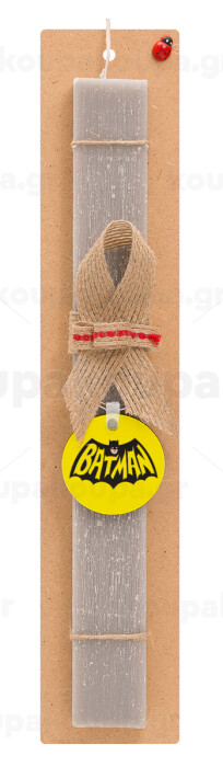 Batman classic logo, Πασχαλινή Λαμπάδα με ξύλινο μπρελόκ & κερί αρωματικό πλακέ (30cm) (ΓΚΡΙ)