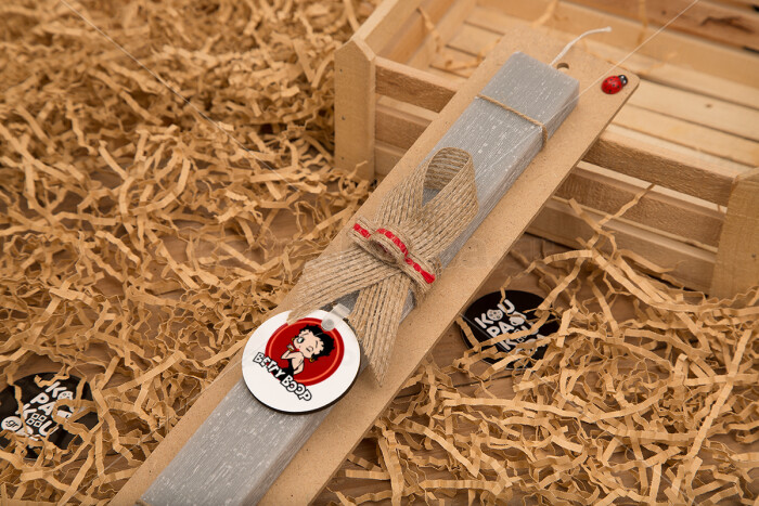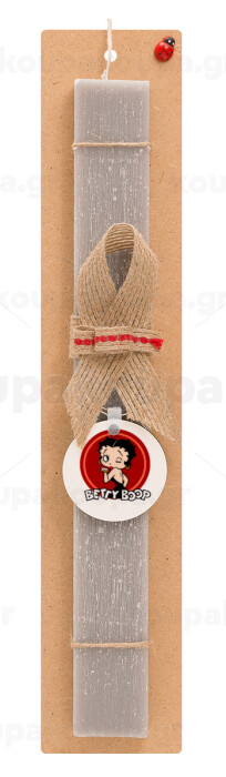 Betty Boop kiss, Πασχαλινή Λαμπάδα με ξύλινο μπρελόκ & κερί αρωματικό πλακέ (30cm) (ΓΚΡΙ)