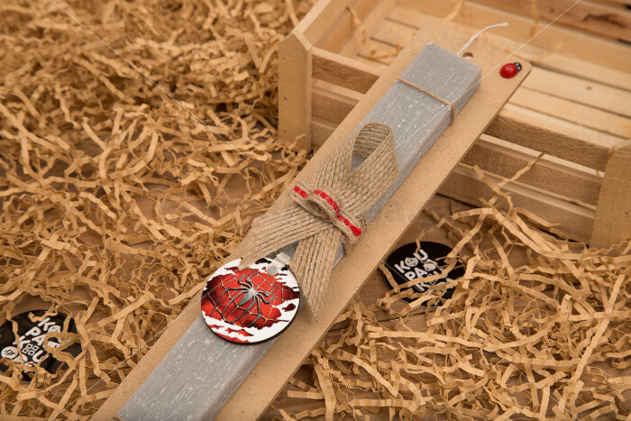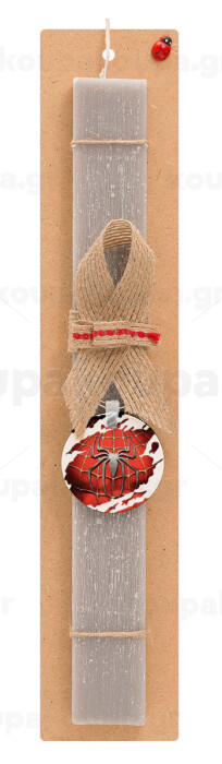 Spiderman cracked, Πασχαλινή Λαμπάδα με ξύλινο μπρελόκ & κερί αρωματικό πλακέ (30cm) (ΓΚΡΙ)