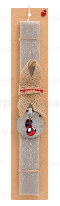 Spiderman upside down, Πασχαλινή Λαμπάδα με ξύλινο μπρελόκ & κερί αρωματικό πλακέ (30cm) (ΓΚΡΙ)