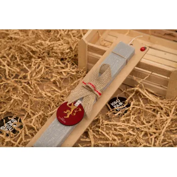 House Lannister GOT, Πασχαλινή Λαμπάδα με ξύλινο μπρελόκ & κερί αρωματικό πλακέ (30cm) (ΓΚΡΙ)