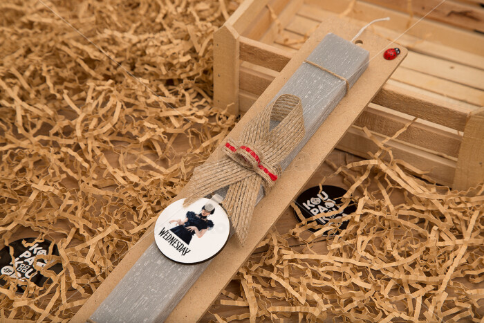 Wednesday Adams, dance with hands, Πασχαλινή Λαμπάδα με ξύλινο μπρελόκ & κερί αρωματικό πλακέ (30cm) (ΓΚΡΙ)
