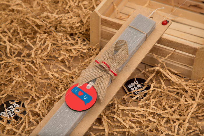 I Love You text message, Πασχαλινή Λαμπάδα με ξύλινο μπρελόκ & κερί αρωματικό πλακέ (30cm) (ΓΚΡΙ)