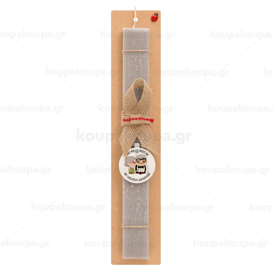 UP, YOU WILL ALWAYS BE MY GREATEST ADVENTURE, Πασχαλινή Λαμπάδα με ξύλινο μπρελόκ & κερί αρωματικό πλακέ (30cm) (ΓΚΡΙ)