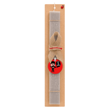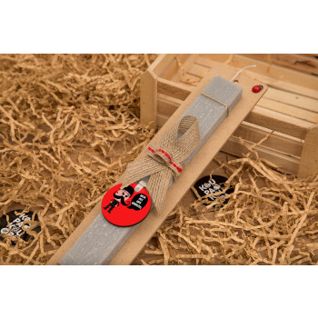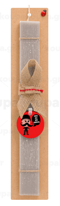 Κρητικός "Ίντα λες ωρέ κοπέλι", Πασχαλινή Λαμπάδα με ξύλινο μπρελόκ & κερί αρωματικό πλακέ (30cm) (ΓΚΡΙ)