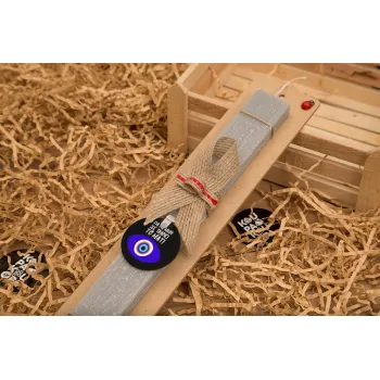 Για να μην σε πιάνει το μάτι, Πασχαλινή Λαμπάδα με ξύλινο μπρελόκ & κερί αρωματικό πλακέ (30cm) (ΓΚΡΙ)