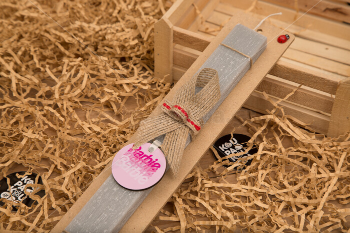 Barbie repeat, Πασχαλινή Λαμπάδα με ξύλινο μπρελόκ & κερί αρωματικό πλακέ (30cm) (ΓΚΡΙ)