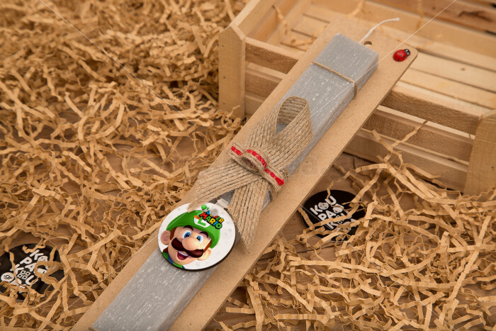 Super mario Luigi, Πασχαλινή Λαμπάδα με ξύλινο μπρελόκ & κερί αρωματικό πλακέ (30cm) (ΓΚΡΙ)
