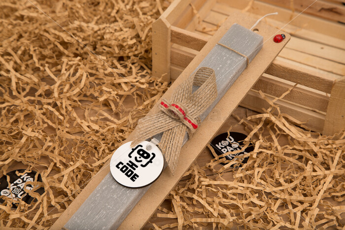Code Heroes symbol, Πασχαλινή Λαμπάδα με ξύλινο μπρελόκ & κερί αρωματικό πλακέ (30cm) (ΓΚΡΙ)