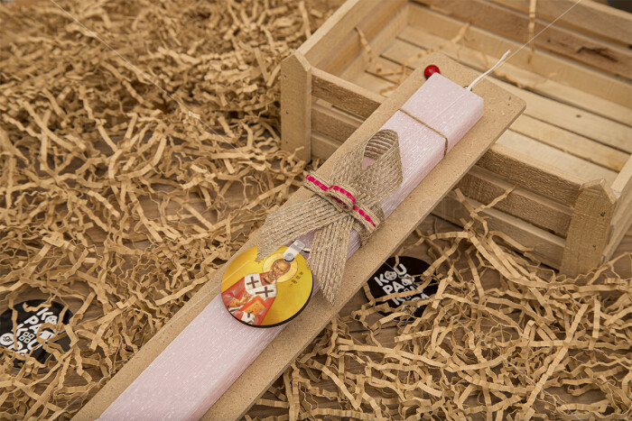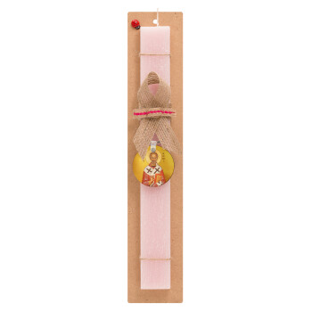 Άγιος Νικόλαος, Πασχαλινή Λαμπάδα με ξύλινο μπρελόκ & κερί αρωματικό πλακέ (30cm) (ΡΟΖ)